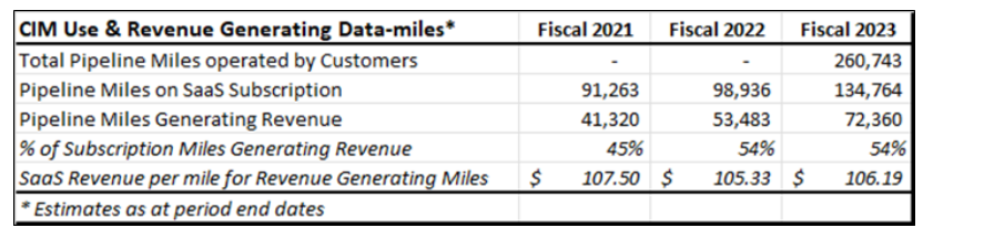 - Use of the CIM platform by customers increased in accordance with management's expectations during fiscal 2023, with higher pipeline miles operated by customers and miles under SaaS subscriptions that drove revenue in fiscal 2023. OneBridge onboarded five additional pipeline operators during fiscal 2023, which became new CIM users due to direct sales efforts, or after being acquired by existing customers that use the CIM platform. Some customers expanded their use of the CIM platform to include ICM and other new functionality modules, a trend OneSoft believes will generate additional revenue in future periods.