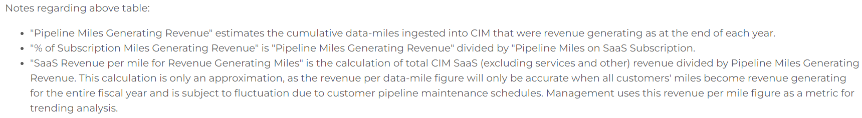 The pipeline miles table entitled "CIM use and revenue-generating data-miles" estimates the aggregate pipeline miles operated by all customers, miles of customers' pipeline assets that are subject to multiyear SaaS agreements and miles of pipeline data ingested into the company's CIM platform on which revenue is earned (data-miles). As these figures are subject to constant changes, OneSoft cautions that information in the table should only be viewed as approximations -- as a snapshot in time.