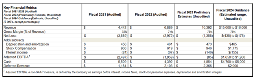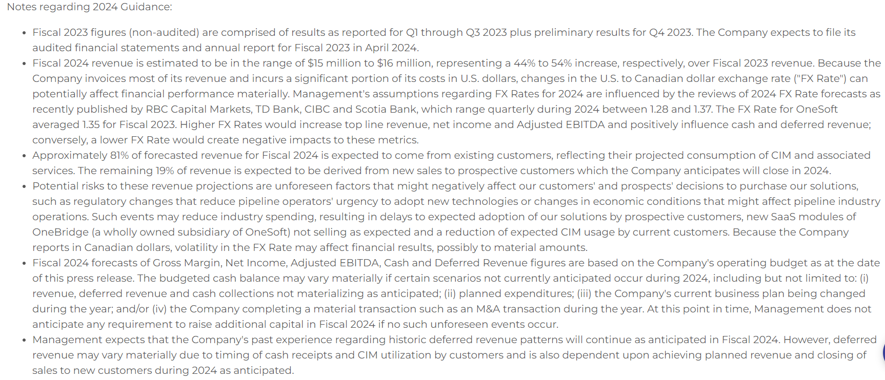 - OneSoft is issuing fiscal 2024 guidance for revenue of $15-million to $16-million, adjusted EBITDA between $1.6-million and $1.9-million, and forecasted cash at the end of 2024 of between $4.7-million and $5-million.