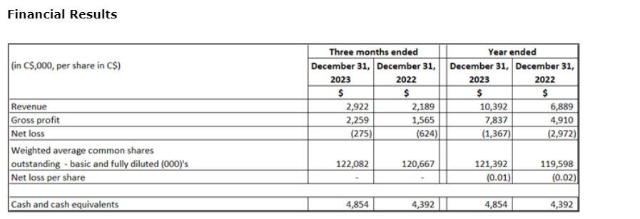 - Revenue for fiscal 2023 was $10.4-million, a 51-per-cent, or $3.5-million, increase over fiscal 2022. Revenue in Q4 2023 was $2.9-million, a 33-per-cent increase over Q4 2022.