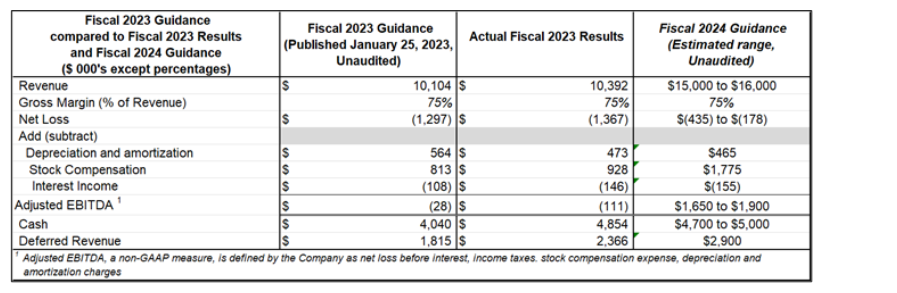 - Adjusted EBITDA (earnings before interest, taxes, depreciation and amortization), a non-GAAP (generally accepted accounting principles) measure, improved from a loss of $2-million in fiscal 2022 to a near-breakeven loss of $100,000 in fiscal 2023. In Q4 2023, adjusted EBITDA improved by $500,000 from a loss of $400,000 in Q4 2022 to positive $200,000.