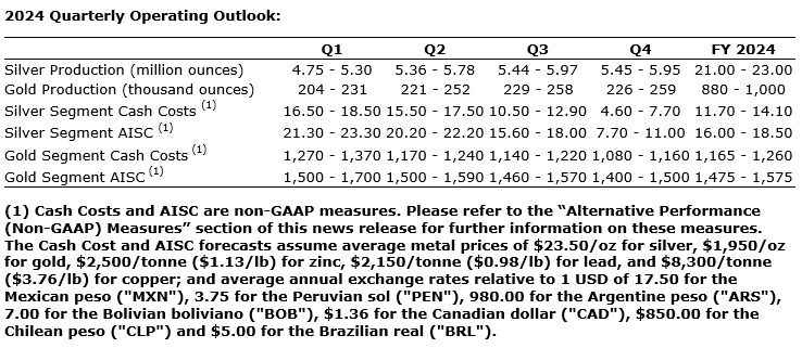 Pan American provided its operating outlook for 2024 in the news release dated Jan. 17, 2024, as further detailed below and in the company's management's discussion and analysis for the period ended Dec. 31, 2023.
