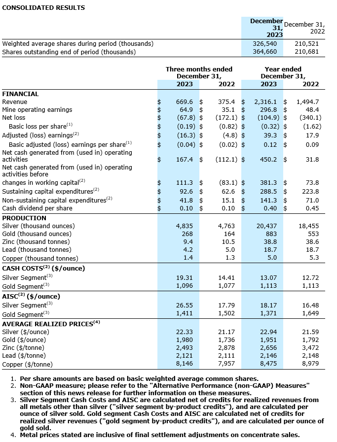 Pan American Silver Corp. has released its fourth quarter (Q4 2023) financial results and audited financial results for the year ended Dec. 31, 2023 (fiscal year (FY) 2023).