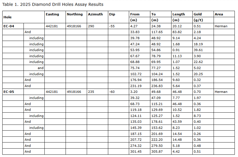 Diamond drill holes EC-04 and EC-05 followed up on drill hole results from ED-27 and ED-28 (see press release dated Oct. 8, 2025) and confirmed that strong gold mineralization continues to both the north and south in the Herman area, intersecting broad gold mineralization that includes higher-grade zones and is hosted in mineralized contact zones, structures and breccias between the host sedimentary rocks and the various dioritic intrusions (Table 1).
