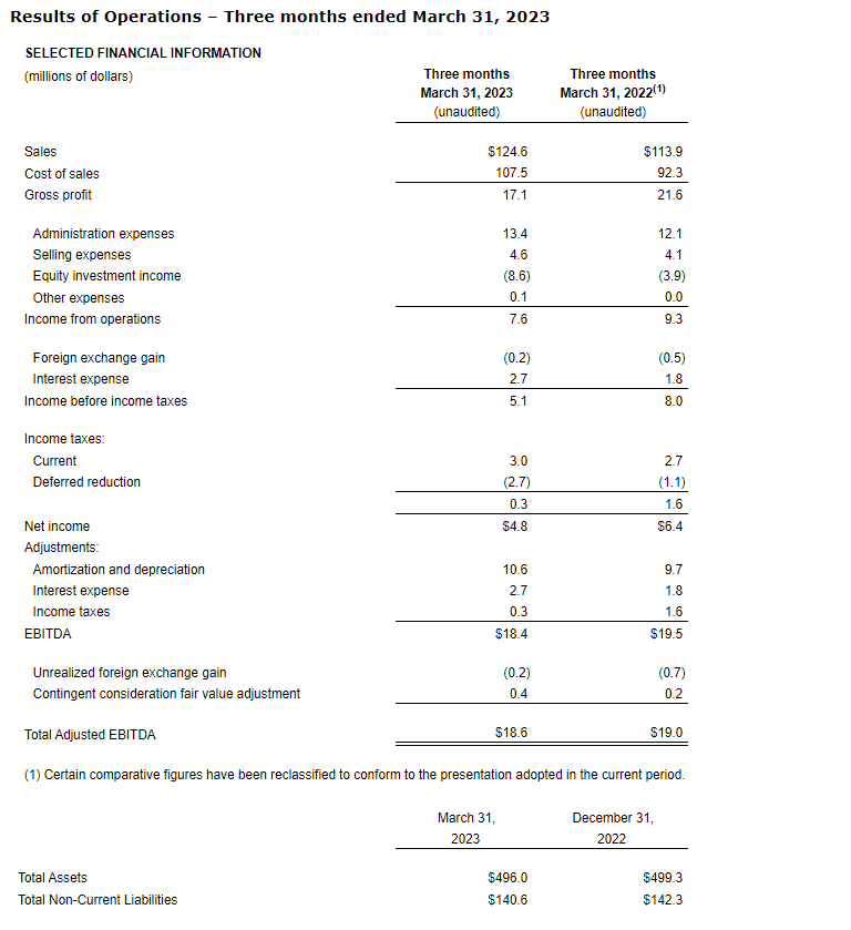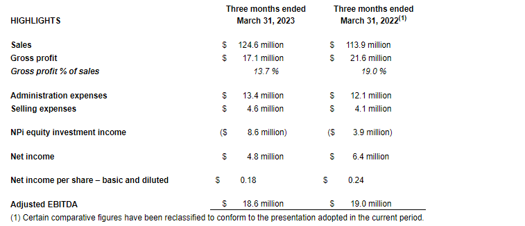- Adjusted EBITDA (earnings before interest, taxes, depreciation and amortization) of $18.6-million, compared with $19.0-million in the first quarter of 2022.