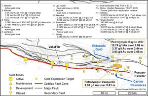 This geophysical program has allowed to define on the Vauquelin Property a structural context comprising several deformation corridors which are favorable to the presence of gold mineralization, as evidenced by the gold mineralization previously defined by drilling on the Rayon d'Or gold zone. This structural context is similar to that of the Chimo mine owned by Cartier Resources and located less than 5 km south of Vauquelin (Figure 1). Like on the Vauquelin Property, mineralization at the Chimo mine includes numerous gold zones associated with structures present in three deformation corridors (Cartier Resources web site).