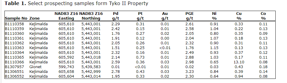 PALLADIUM ONE SAMPLES UP TO 1.0% NICKEL, 2.4 G/T PALLADIUM AT TYKO II, DRILL PROGRAM CONTINUES ON TYKO NI - CU PROJECT