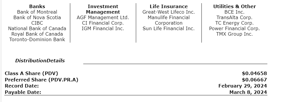 Prime Dividend Corp. has declared its monthly distribution of 4.658 cents for each Class A share and 6.667 cents for each preferred share. Distributions are payable March 8, 2024, to shareholders on record as at Feb. 29, 2024.