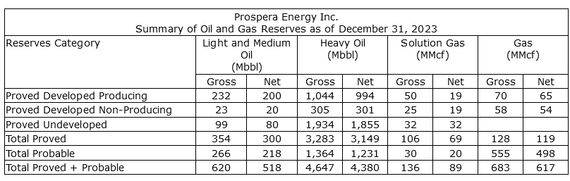Prospera Energy's Dec. 31, 2023, year-end reserves were independently assessed by InSite Petroleum Consultants Ltd. in accordance with COGEH (Canadian Oil and Gas Evaluation Handbook) standards. The Insite report confirmed a current recovery rate of 9 per cent (of 397 MMbbl discovered OOIP) using a combination of vertical and horizontal wells, primarily in core assets located in Southwest and West-Central Saskatchewan (>42,000 acres). Prospera Energy's 2P reserve value only reflects a portion of the remaining recoverable reserves and does not include the development of the largest core property in Saskatchewan (282 MMbbl OOIP) that is scheduled to commence exploitation in 2024. Also, there have been no improved recovery method benefits applied to these fields to date, yet. These upcoming development and enhanced recovery methods are expected to provide substantial steady upside to Prospera Energy's future reserves valuation.