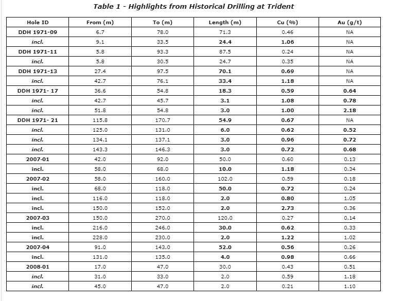 - Planned surveying totals 164 line-kilometres to provide coverage of primary target area (historical assays at Trident which include DDH-1971-13: 70.07 m at 0.69 per cent copper, DDH 2007-2: 100 m at 0.59 per cent Cu and 0.18 gram per tonne gold, including two m at 2.73 per cent Cu and 0.36 g/t Au).