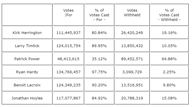 As a result, Kirk Herrington, Larry Timlick, Ryan Hardy, Ben Lacroix and Jonathan Hoyles were elected as directors of the corporation to serve until the close of the next annual meeting of shareholders of the corporation or until their successors are elected or appointed.