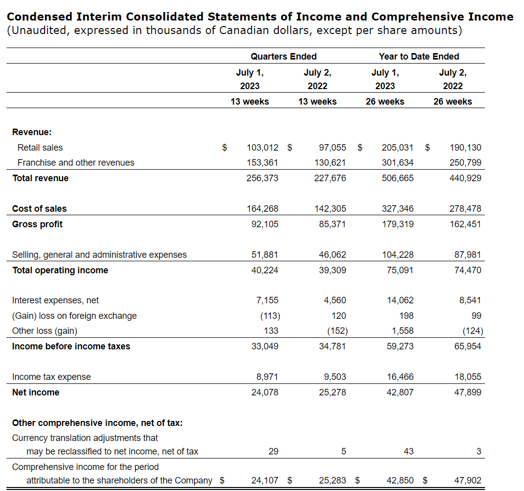Revenue was $256.4-million in Q2 2023, an increase of $28.7-million, or 12.6 per cent, compared with $227.7-million in Q2 2022. The increase in revenue was driven by growth in retail sales, as well as franchise and other revenues.