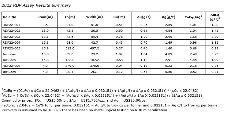 - Hole RDP-22-001 intersected 51.5 m of 1.01 per cent CuEq (0.51 per cent Cu, 0.65 g/t Au and 2.59 g/t Ag) from surface.