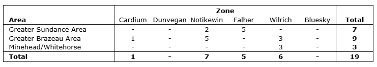 The bulk of first quarter 2023 activity was spread out amongst the existing core areas of greater Sundance and greater Brazeau. Additionally, three wells were drilled in the Minehead/Whitehorse region as part of a delineation and farm-in program to earn certain offsetting lands. Target formations were also widespread, as summarized in the attached table.