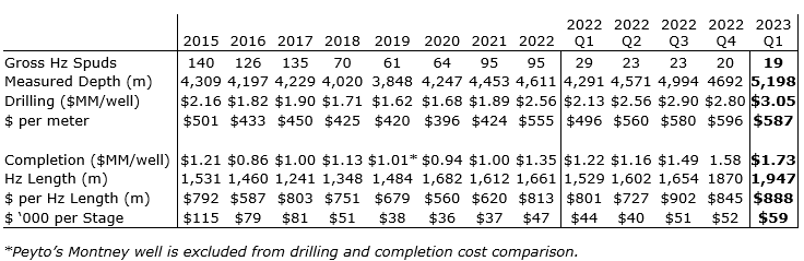 Average measured depth drilled increased 11 per cent in the quarter compared with fourth quarter of 2022, as Peyto drilled the longest average wells in the company's history. The pursuit of extended-reach horizontal (ERH) wells resulted in lower costs per metre drilled as compared with the previous quarter. Although inflationary pressures have eased on drilling operations, completion costs per metre and per stage were up 5 per cent and 13 per cent, respectively, due to service rate increases as compared with the previous quarter.