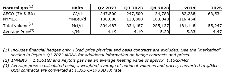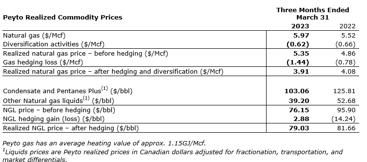 Peyto's realized prices for the three months ended March 31, 2023, and March 31, 2022, and are shown in the attached table.