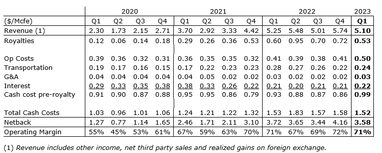 of $1.52 per mcfe (thousand cubic feet equivalent) (or 99 cents per mcfe before royalties): Quarterly cash costs of 99 cents per mcfe, before royalties of 53 cents per mcfe, were 6 per cent higher than Q1 2022, due to inflationary pressures on costs. Q1 operating costs of 50 cents per mcfe, transportation of 24 cents per mcfe, general and administrative (G&A) of three cents per mcfe, and interest expense of 22 cents per mcfe resulted in a 71-per-cent operating margin. Peyto continues to have the lowest cash costs in the Canadian natural gas industry.