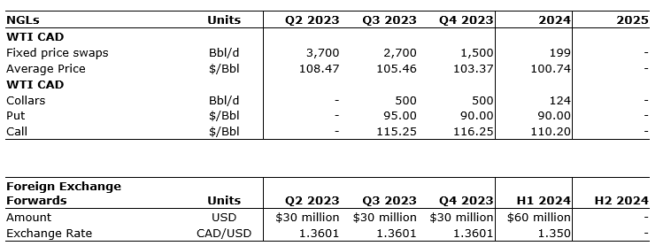 Peyto currently has 317,977 mcf/d (thousand cubic feet per day) fixed with financial hedges for April 1, 2023, to Dec. 31, 2023, at $4.49 per mcf. The company's current financial commodity hedges and foreign exchange forward contracts are summarized in the attached table.