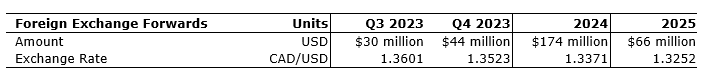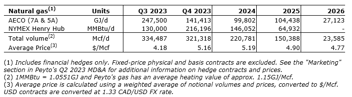 Peyto currently has 327,902,000 cubic feet per day fixed with financial hedges for the second half of 2023 at $4.66 per mcf and 220,781,000 cubic feet per day fixed with financial hedges for 2024 at $5.19 per mcf. The company's current financial commodity hedges and foreign exchange forward contracts are summarized in the attached table.