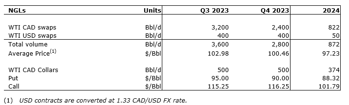 Condensate and pentanes volumes were sold in Q2 2023 for an average price of $90.97 per barrel (bbl), which is down 32 per cent from $134.57 per bbl in Q2 2022, while Canadian WTI (West Texas Intermediate) decreased 28 per cent to $99.11 per bbl over the same period. Butane and propane volumes were sold in combination at an average price of $28.11 per bbl or 28 per cent of light oil price, down 51 per cent from $57.03 per bbl in Q2 2022. NGL (natural gas liquid) hedging gains increased the combined realized NGL price of $66.11 per bbl by $3.16 per bbl to $69.28 in the quarter. Peyto's realized NGL price in the quarter was affected by increased liquids trucking, as a major third party liquids pipelines were shut in due to maintenance that was extended by the wildfires.