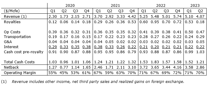 of $1.21 per thousand cubic feet equivalent (mcfe) (or $1.03 per mcfe before royalties): Quarterly cash costs of $1.03 per mcfe, before royalties of 18 cents per mcfe, were 17 per cent higher than Q2 2022 due to inflationary pressures on costs and additional transportation service. Q2 operating costs of 47 cents per mcfe, transportation of 29 cents per mcfe, G&A (general and administrative expenses) of five cents per mcfe and interest expense of 22 cents per mcfe resulted in a 70-per-cent operating margin. Peyto continues to have the lowest cash costs in the Canadian natural gas industry.