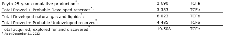 The reserves attributed to the Repsol assets in the report are 92 MMboe, 195 MMboe and 300 MMboe in the PDP, TP and P+P categories, respectively, at Dec. 31, 2023 (excluding the eight wells drilled by Peyto on the assets in fourth quarter 2023).
