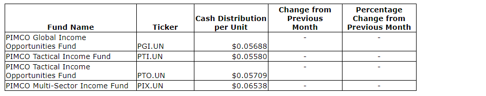 Unitholders are reminded that each fund offers a distribution reinvestment plan (DRIP) which will provide unitholders with the ability to automatically reinvest their distributions. Eligible unitholders are encouraged to contact the institution through which they hold their units to confirm enrolment procedures and timelines. A copy of the DRIP is available at the PIMCO website.