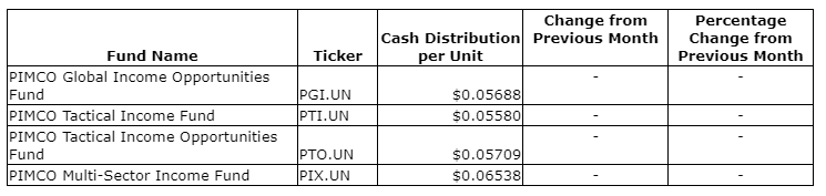 PIMCO CANADA CORP. ANNOUNCES MONTHLY DISTRIBUTIONS FOR PIMCO CANADA CLOSED END FUNDS