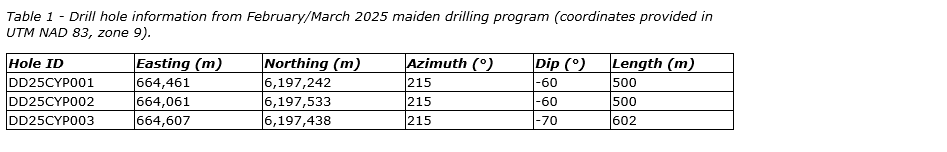 Following the maiden drill program, a deep-penetrating IP survey was designed to outline the distribution of disseminated sulphides within the hydrothermal system. IP results, along with alteration, lithology and pyrite mineralization observed in drill core, suggest the northeastern margin of the system was drilled. The survey results indicated the vast majority of disseminated sulphides occur 1.2 kilometres to the southwest of the nearest drill hole (DD25CYP002).
