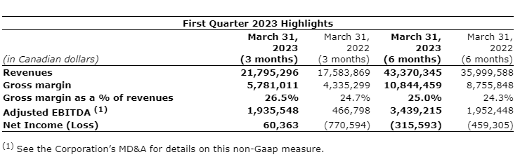 The corporation had revenues of $21.8-million for the second quarter ($17.6-million for the same period in 2022).