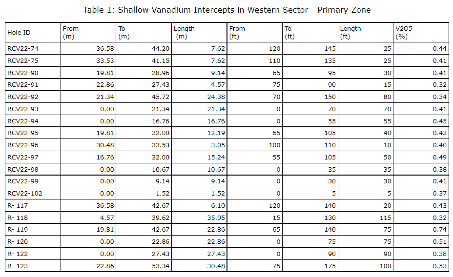 Nineteen holes, generally 50 metres apart, were completed in an area 300 metres by 250 m in the western limits of the deposit. Intercepts tabled below, are new and outside of the 2019 indicated resource estimate. Two generally flat-lying vanadium zones were encountered in this area. The primary zone (intercepts shown in the table entitled "Shallow vanadium intercepts in western sector -- primary zone") averages 15.16 m (49.74 feet) thick grading 0.43 per cent V2O5 (vanadium oxide), found 15 m (49 feet) below surface. A second zone (intercepts shown in the table entitled "Shallow vanadium intercepts in western sector -- secondary zone") averages 4.76 m (15.6 feet) thick grading 0.40 per cent V2O5. The two zones are separated by roughly 14.6 m (47 feet).