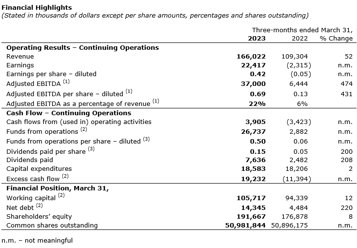 Adjusted EBITDA (earnings before interest, taxes, depreciation and amortization) from continuing operations increased to an all-time quarterly record of $37-million, which represented 22 per cent of consolidated revenue, also the highest quarterly record. Included in the 2023 quarter's adjusted EBITDA is $1.4-million in cash-settled share-based compensation expense. Excluding cash-settled share-based compensation expense, adjusted EBITDA from continuing operations in the first quarter of 2023 was $38.4-million, 23 per cent of consolidated revenue.