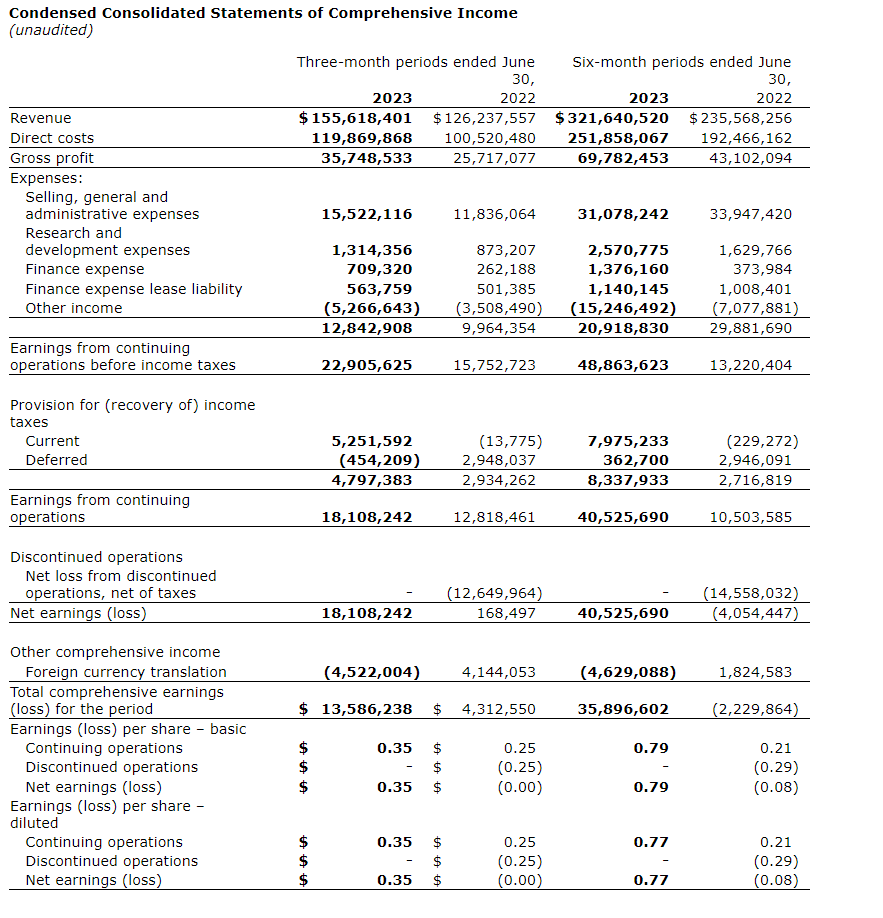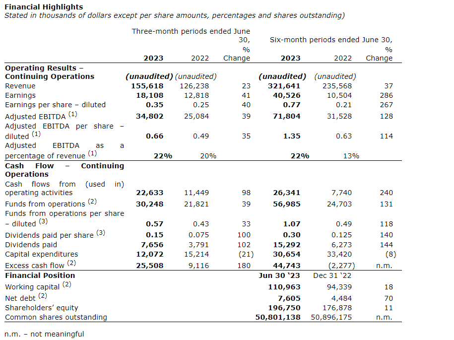 Earnings from continuing operations and adjusted EBITDA (earnings before interest, taxes, depreciation and amortization) generated in the 2023 quarter are the best second quarter results in the corporation's history. For the three-month period ended June 30, 2023, earnings from continuing operations increased to $18.1-million from $12.8-million in the comparable 2022 period, an increase of 41 per cent. Adjusted EBITDA from continuing operations increased to $34.8-million (22 per cent of revenue) which is 39 per cent higher than the adjusted EBITDA reported in the same 2022 period of $25.1-million (20 per cent of revenue). Included in the 2023 three-month period adjusted EBITDA from continuing operations is cash-settled share-based compensation expense of $2.6-million (2022 -- $700,000). For the three-month period ended June 30, 2023, excluding cash-settled share-based compensation expense, adjusted EBITDA from continuing operations is $37.4-million, 24 per cent of consolidated revenue (2022 -- $25.8-million).