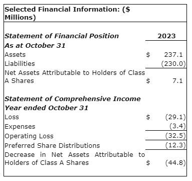 Premium Income Corp. has released the results of operations for the fiscal year ended Oct. 31, 2023. The decrease in net assets attributable to holders of Class A shares amounted to $44.8-million, or $3.20 per Class A share. Net assets attributable to holders of Class A shares were $7.1-million, or 46 cents per Class A share. Cash distributions of 86 cents per preferred share and 81 cents per Class A share were paid during the year.