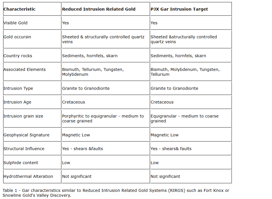 The Gar target area exhibits geological, mineralogical, geophysical characteristics, as well as sheeted gold-bearing veins, that are comparable with reduced intrusion-related gold systems exemplified by deposits such as Kinross's Fort Knox and Snowline Gold's Valley (refer to Table 1).