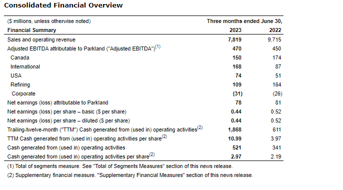 Parkland Corp. has released its financial and operating results for the three and six months ended June 30, 2023.