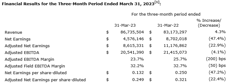 - Adjusted EBITDA (earnings before interest, taxes, depreciation and amortization) was $20,541,390 compared with $21,415,073 for the three-month period ended March 31, 2022.