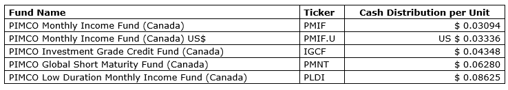PIMCO CANADA CORP. ANNOUNCES MONTHLY DISTRIBUTIONS FOR PIMCO CANADA EXCHANGE TRADED SERIES