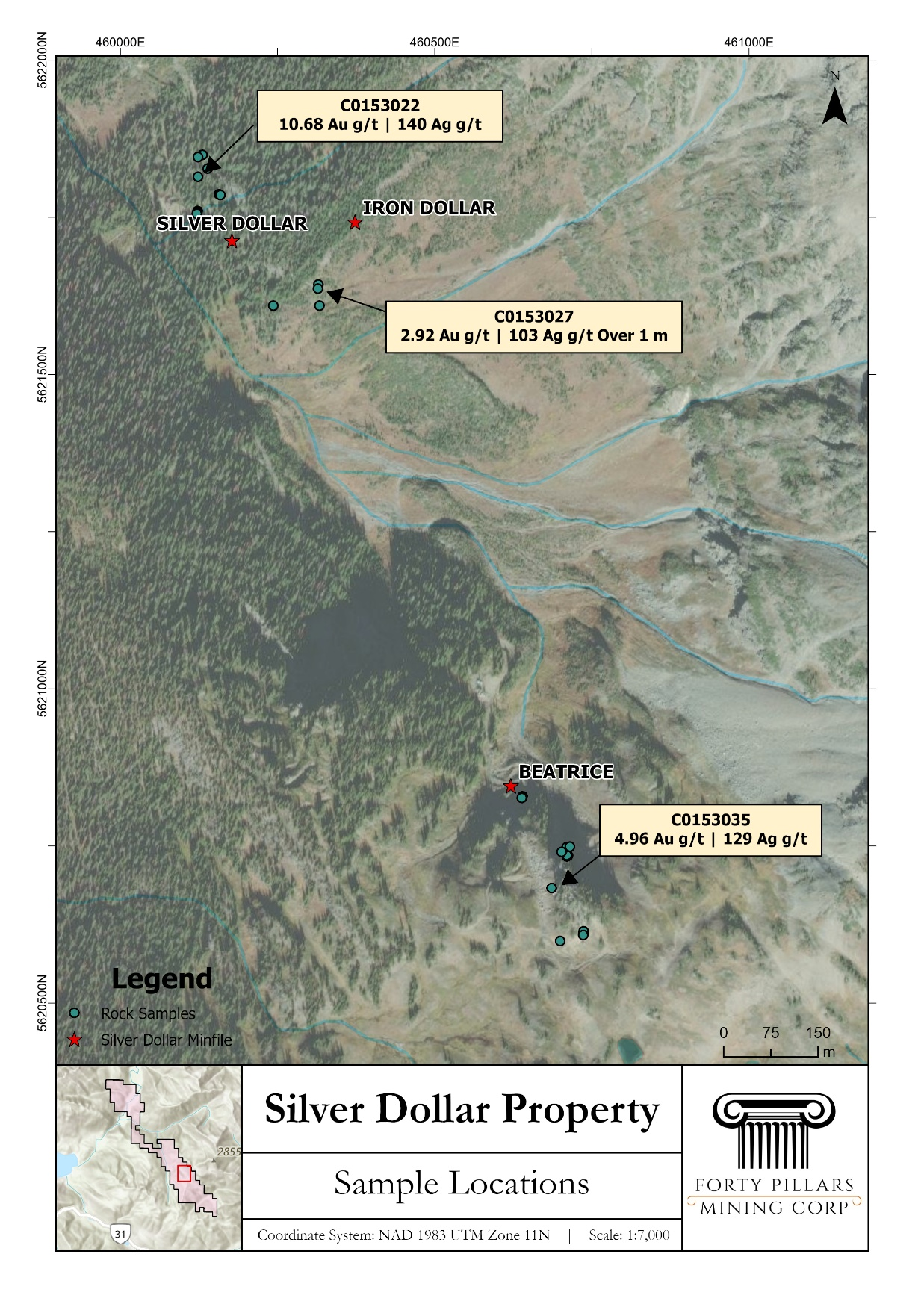 At the Silver Dollar past-producer, grab samples returned up to 10.68 g/t Au, 203 g/t Ag, 0.17% Cu and 0.12 % Sb. Nearby, at a newly-discovered historical working likely related to the Iron Dollar occurrence, a 1.0 m channel sample (C0153022) produced 2.92 g/t Au, 103 g/t Ag and 0.06 % Sb. At the Beatrice past-producer, over 1.0 km to the southeast, best results from grab samples include 4.96 g/t Au, 340 g/t Ag and 0.11% Sb. All three locations also contain high Pb and Zn values, with multiple samples returning >1.0%, the upper detection limit for the chosen assay method.