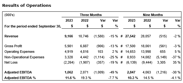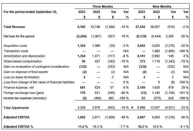 - For the nine months ended Sept. 30, 2023, net loss was $6,139, a decrease of 35 per cent versus the comparable period. The loss to September, 2023, declined due to a reduction in acquisition costs, share-based compensation, foreign exchange and nil transaction costs, offset by an increase in the income taxes and a decline in adjusted EBITDA.