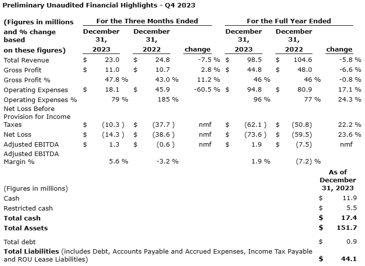 PLANET 13 REPORTS UNAUDITED, PRELIMINARY FOURTH QUARTER AND FULL YEAR 2023 FINANCIAL RESULTS AND DATE FOR FULL EARNINGS RELEASE