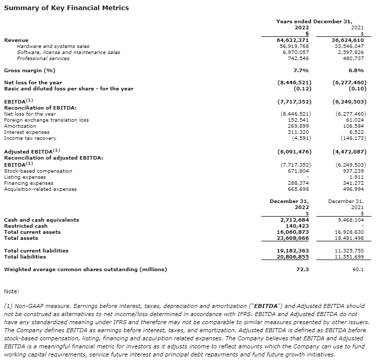 - Hardware and systems sales revenue for the three months ended Dec. 31, 2022, totalled $16,723,631 compared with $12,098,191 for the three months ended Dec. 31, 2021. Software, licence and maintenance sales revenue for the year ended Dec. 31, 2022, was $596,140 compared with $497,892 in the prior year ended Dec. 31, 2021. Professional services revenue was $502,453 for the three months ended Dec. 31, 2022, compared with $102,508 for the three months ended Dec. 31, 2021.