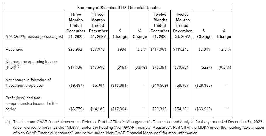 "Looking back at 2023, I would like to highlight some of our accomplishments: (1) Plaza continued to deliver and launch new developments; (2) We successfully completed an equity issuance; (3) The REIT [real estate investment trust] was successful in selling certain non-core assets; and (4) We realized record-high leasing renewal spreads," said Michael Zakuta, president and chief executive officer. "Looking forward, we are well positioned to put the headwinds that have impacted real estate behind us and take advantage of strong demand for essential-needs retailers targeting non-discretionary spending."