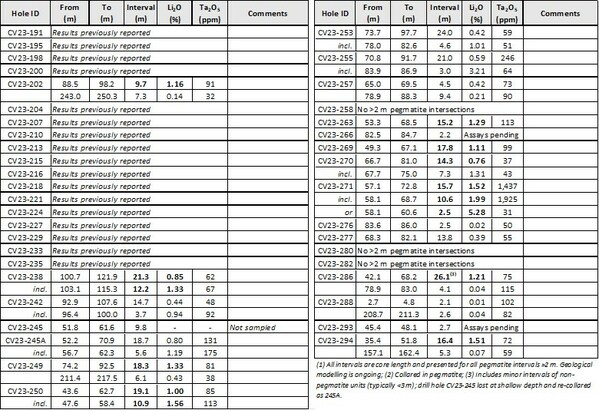 Core sample assays for drill holes reported herein are presented in Table 1 for all pegmatite intersections >2 m. Drill hole locations and attributes are presented in Table 2. For drill holes completed in 2023, results remain to be reported for the CV13 Pegmatite (35 holes), the CV5 Pegmatite (54 holes), and the CV9 Pegmatite (18 holes). The Company has completed processing of the drill core backlog from the 2023 program with the final samples to arrive on the lab shortly.