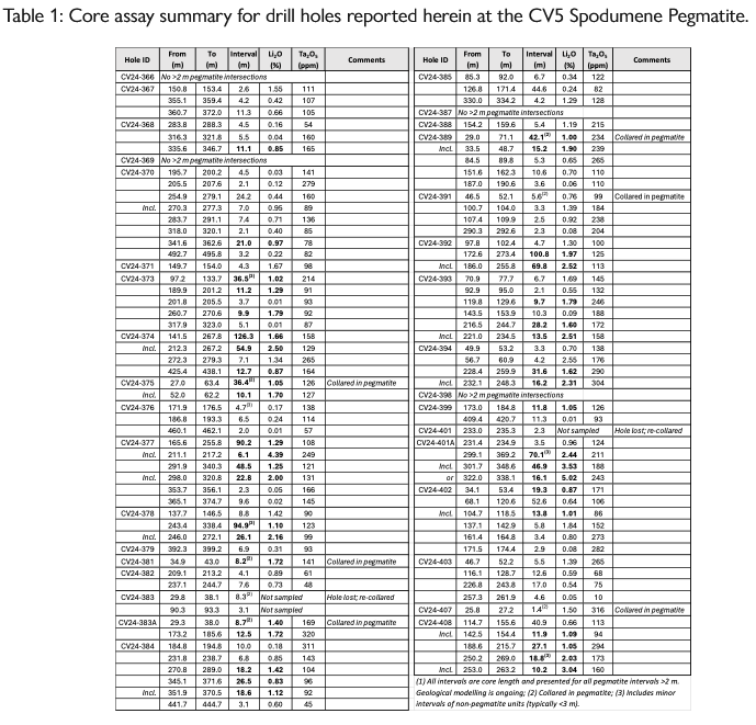 • 70.1 m at 2.44 per cent Li2O, including 46.9 m at 3.53 per cent Li2O or 16.1 m at 5.02 per cent Li2O (CV24-401A).
