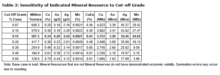 129.0 million tonnes at 0.70% Cu, 0.44 g/t Au, 4.12 g/t Ag and 0.0014%Mo, and 0.91% CuEq grade, at a cut-off of 0.5% CuEq;