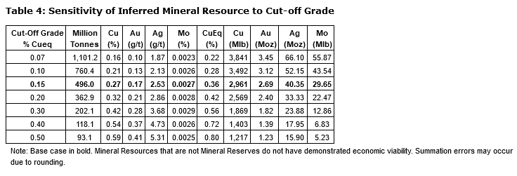 The Mineral Resources of the Project are also reported to demonstrate the sensitivity to various copper equivalent cut-off grades within the optimized pit constraint. The domains have not been separated and the following is for comparison only.