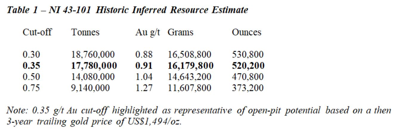 A 2013 mineral resource estimate was prepared by Mercator Geological Services Ltd. in compliance with NI 43-101 reporting requirements and CIM (Canadian Institute of Mining, Metallurgy and Petroleum) standards, based on 3-D block model using 16,001 metres of drilling from 85 drill holes. This report produced an inferred mineral resource of 520,200 ounces of gold, contained within 17.78 million tonnes grading 0.91 gram per tonne gold at a cut-off grade of 0.35 gram per tonne gold. See Table 1 below.