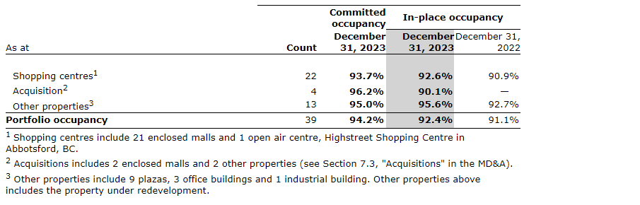 Impact of remeasurements: During the year, GLA was impacted by remeasurements including a reduction of 185,000 square feet in anticipation of the demolition of the former Sears space at Devonshire Mall in Windsor, Ont. Portfolio occupancy, excluding the impact of GLA remeasurements, would have been 91.0 per cent and occupancy for same properties shopping centres would have been 90.7 per cent. Portfolio committed occupancy, excluding the impact of GLA remeasurements, would have been 92.8 per cent.