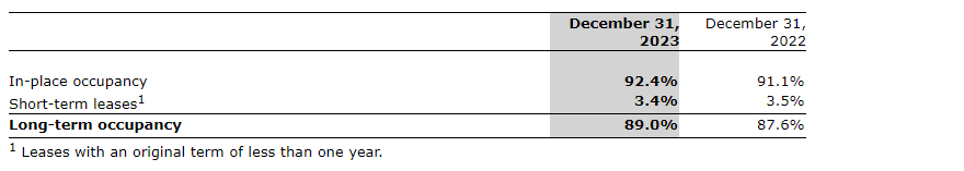 94.2-per-cent committed occupancy, 92.4-per-cent in-place occupancy and 89.0-per-cent long-term occupancy;